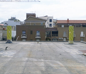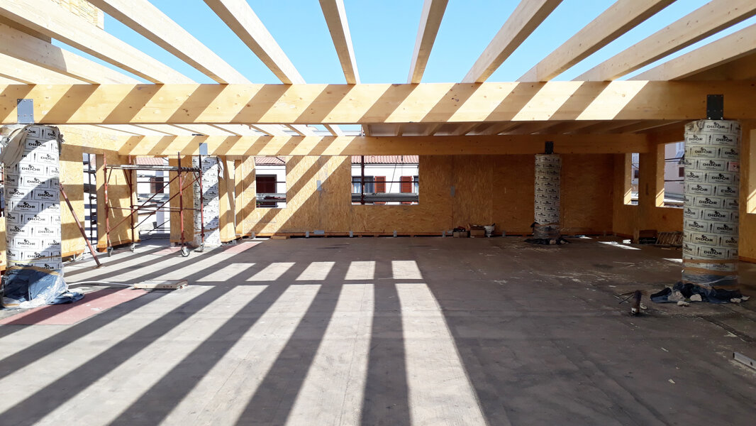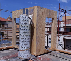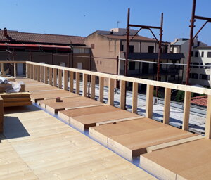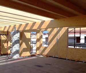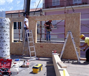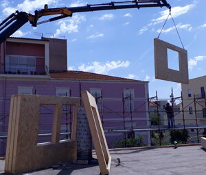 Il progetto architettonico, redatto dall'Arch. Luciano Bebbere, consiste nella sopraelevazione di un immobile a destinazione commerciale sito in centro di Alghero. L'immobile esistente, realizzato negli anni '70, ha una struttura portante costituita da 6 pilastri, travi REP e solai in laterocemento, per una superficie complessiva in pianta di mq 250. Sono state pertanto eseguiti preliminarmente dei controlli inerenti alla resistenza residua dei materiali, per poi proseguire con la verifica della struttura esistente al fine di constatarne la possibilità di sopraelevare la stessa. Dato che l'immobile si trova in pieno centro di Alghero, si è optato per la realizzazione di una sopraelevazione ricorrendo ad elementi prefabbricati in legno quali, pareti accoppiate di OSB marino con interposta lana di roccia e copertura in travi di legno lamellare. In tal modo è stato possibile installare il nuovo involucro in breve tempo, evitando disagi alla circolazione stradale. Oggetto dell'incarico è stato la verifica della struttura esistente, la progettazione strutturale e la direzione dei lavori.